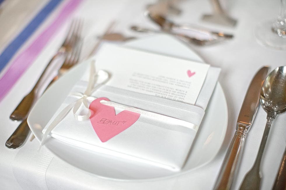 Wickelt ihr ein Schleifenband um die Serviette und ergänzt einen personalisierbaren Anhänger zum Beispiel mit "Schön, dass ihr da seid", fühlt sich jeder Gast gleich doppelt willkommen.