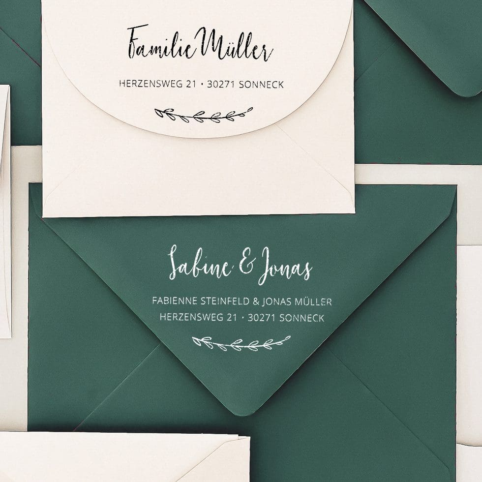Beschriftet eure Briefumschläge mit wunderschönem Adressstempel im Handumdrehen und passt die Stempelfarbe individuell an die Farbe des Umschlags an. Wir gestalten euch den dazu passenden Stempel detailverliebt mit eurem individuellen Text.