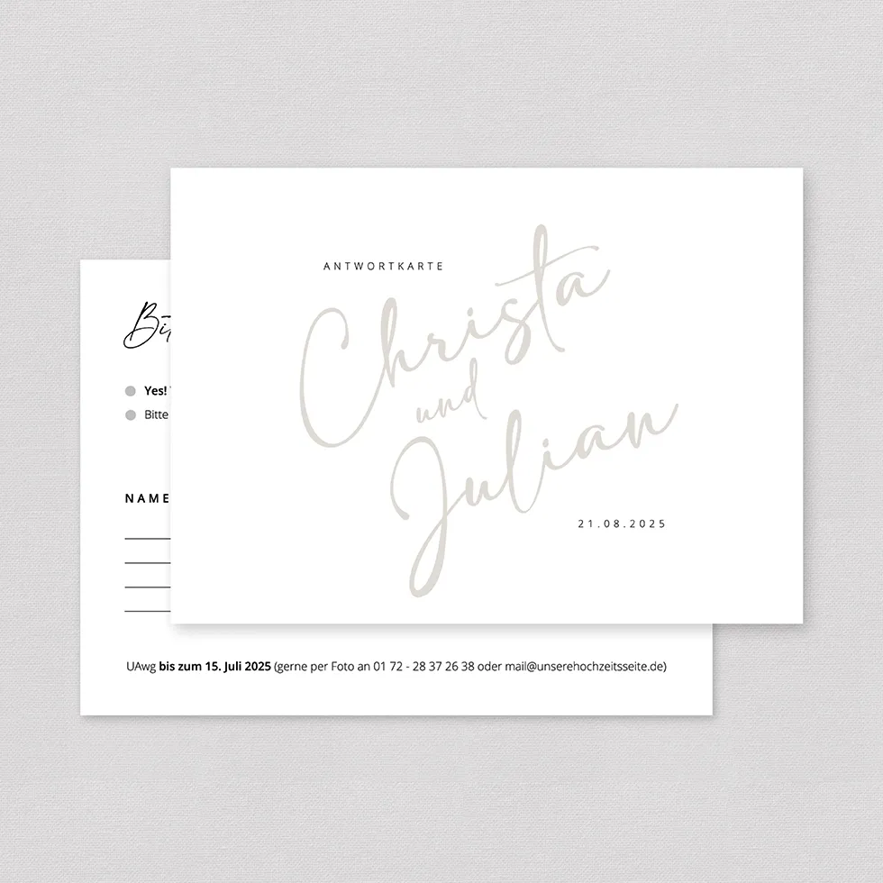 Direkt nach dem Bestelleingang erhaltet ihr eure Antwortkarten-Vorlage zum Downloaden in verschiedenen Formaten in hochwertiger Druckauflösung als PDF, JPG und PNG.