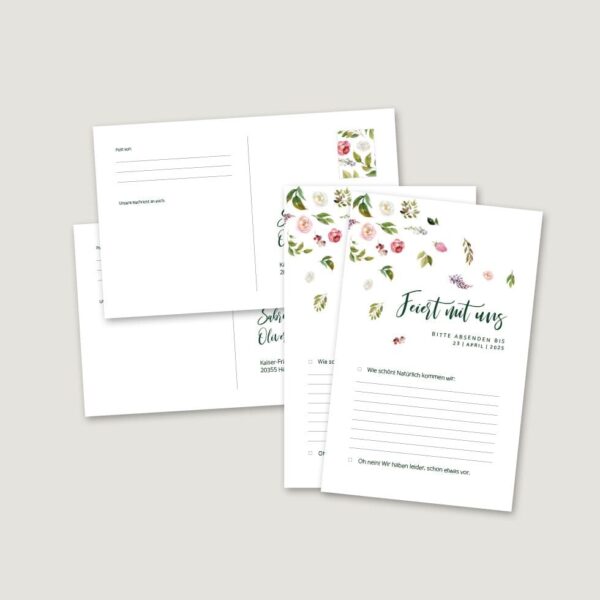 Direkt nach dem Bestelleingang erhaltet ihr eure Antwortkarten-Vorlage zum Downloaden in verschiedenen Formaten in hochwertiger Druckauflösung als PDF, JPG und PNG.