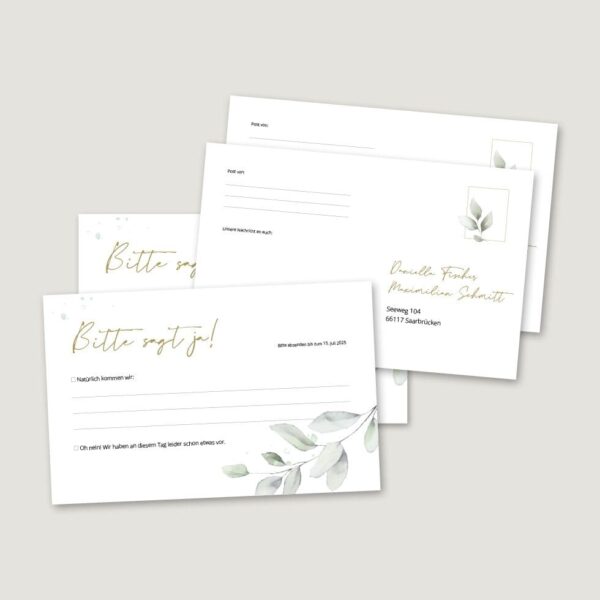 Direkt nach dem Bestelleingang erhaltet ihr eure Antwortkarten-Vorlage zum Downloaden in verschiedenen Formaten in hochwertiger Druckauflösung als PDF, JPG und PNG.