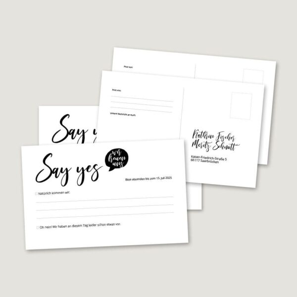 Direkt nach dem Bestelleingang erhaltet ihr eure Antwortkarten-Vorlage zum Downloaden in verschiedenen Formaten in hochwertiger Druckauflösung als PDF, JPG und PNG.