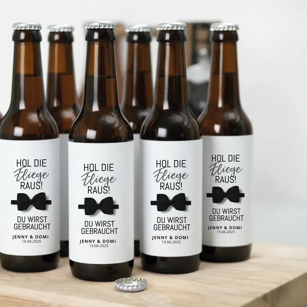 Unsere Etiketten können für alle Bierflaschen verwendet werden: Ob kleine Stubbi-, 0,33-Liter oder 0,5-Liter-Flaschen – Hauptsache euer Flasche hat eine gerade Fläche.