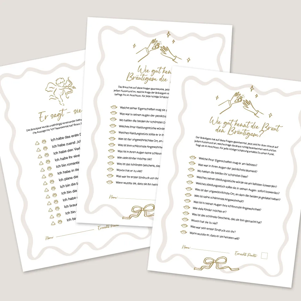- Druckt die Bögen so oft aus wie benötigt – plus einmal für die Antworten von Braut und Bräutigam zum Interviewen.