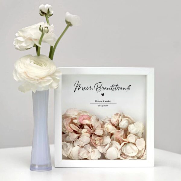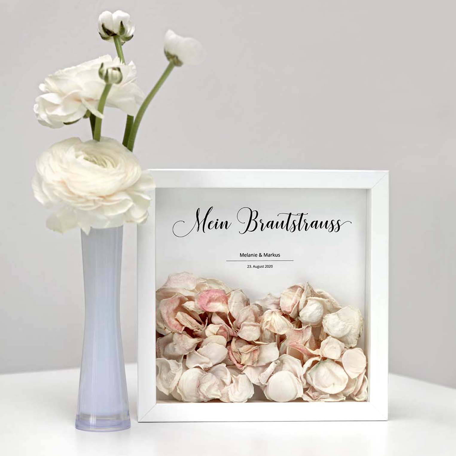 Egal, ob ihr die Blütenblätter einzeln oder am Stiel trocknet (→ hier eine Anleitung)– mit unserem Brautstrauß Bild bewahrt ihr ihn sicher für die Ewigkeit auf. So könnt ihr all die Emotionen eures Hochzeitstags inklusive all eure Wünsche, Gedanken und Überlegungen für diesen einzigartigen Tag konservieren.