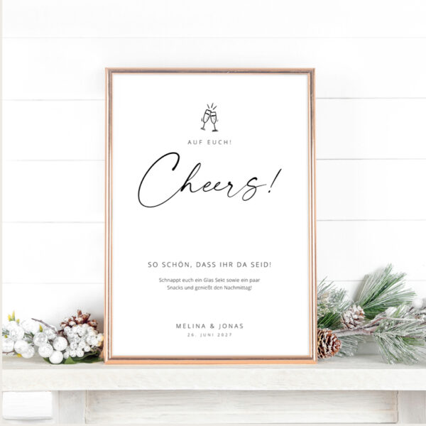 „Cheers“ Schild Sektempfang