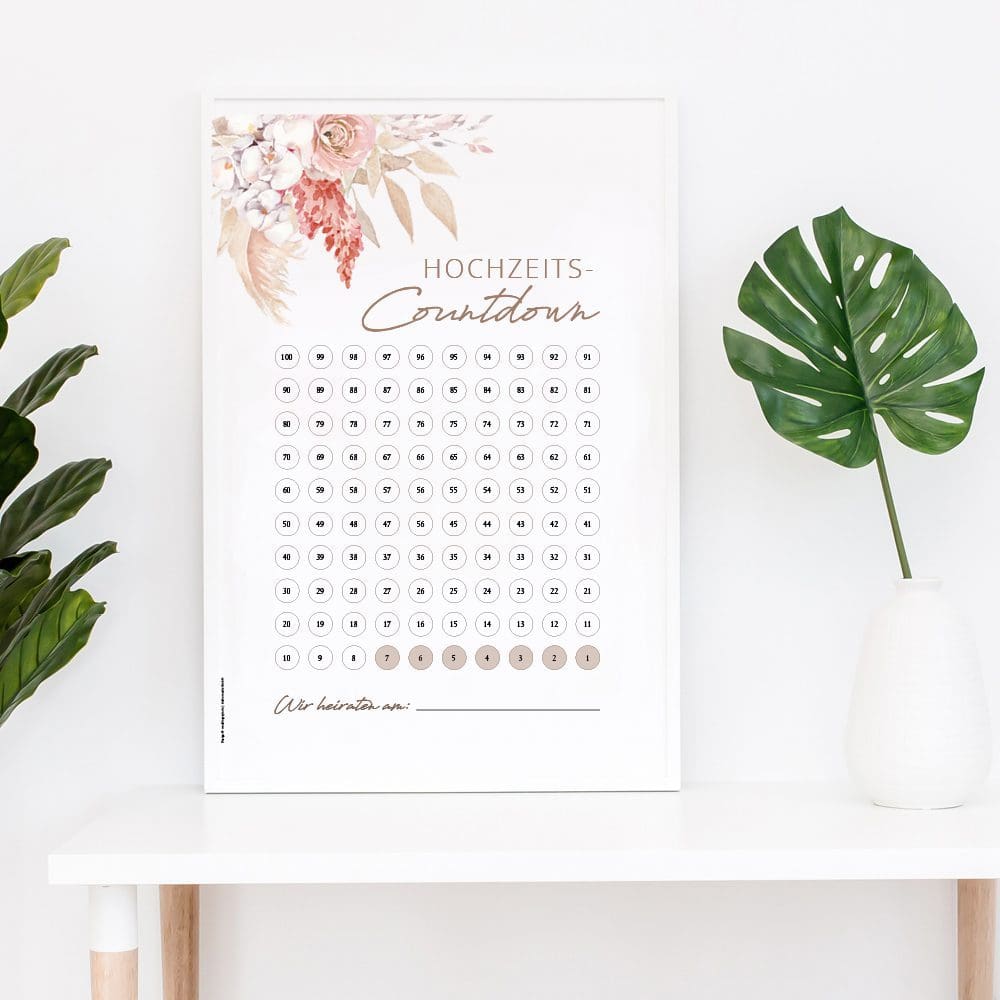 Schenkt dem Brautpaar zur Verlobung oder als kleines Geschenk kurz vor der Hochzeit ein süßes Poster, mit denen die letzten Tage voller Aufregung bis zur Hochzeit gezählt werden können.