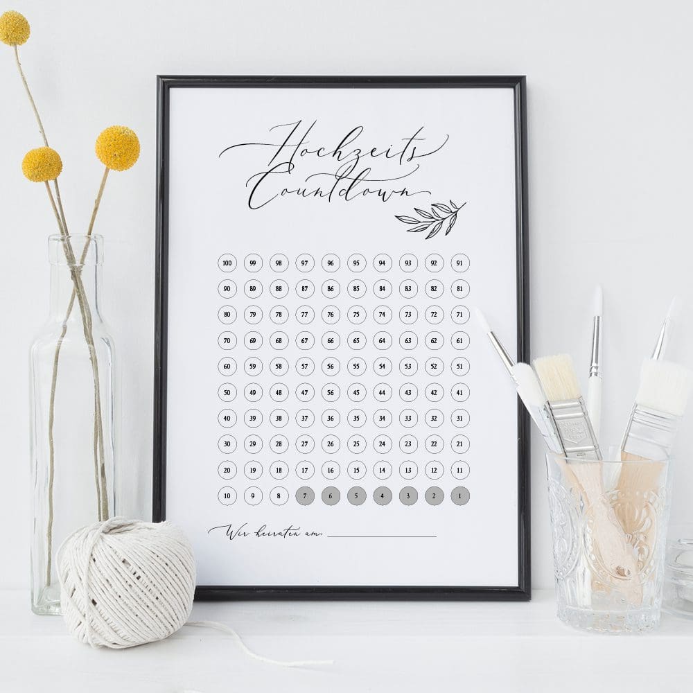Schenkt dem Brautpaar zur Verlobung oder als kleines Geschenk kurz vor der Hochzeit ein süßes Poster, mit denen die letzten Tage voller Aufregung bis zur Hochzeit gezählt werden können.