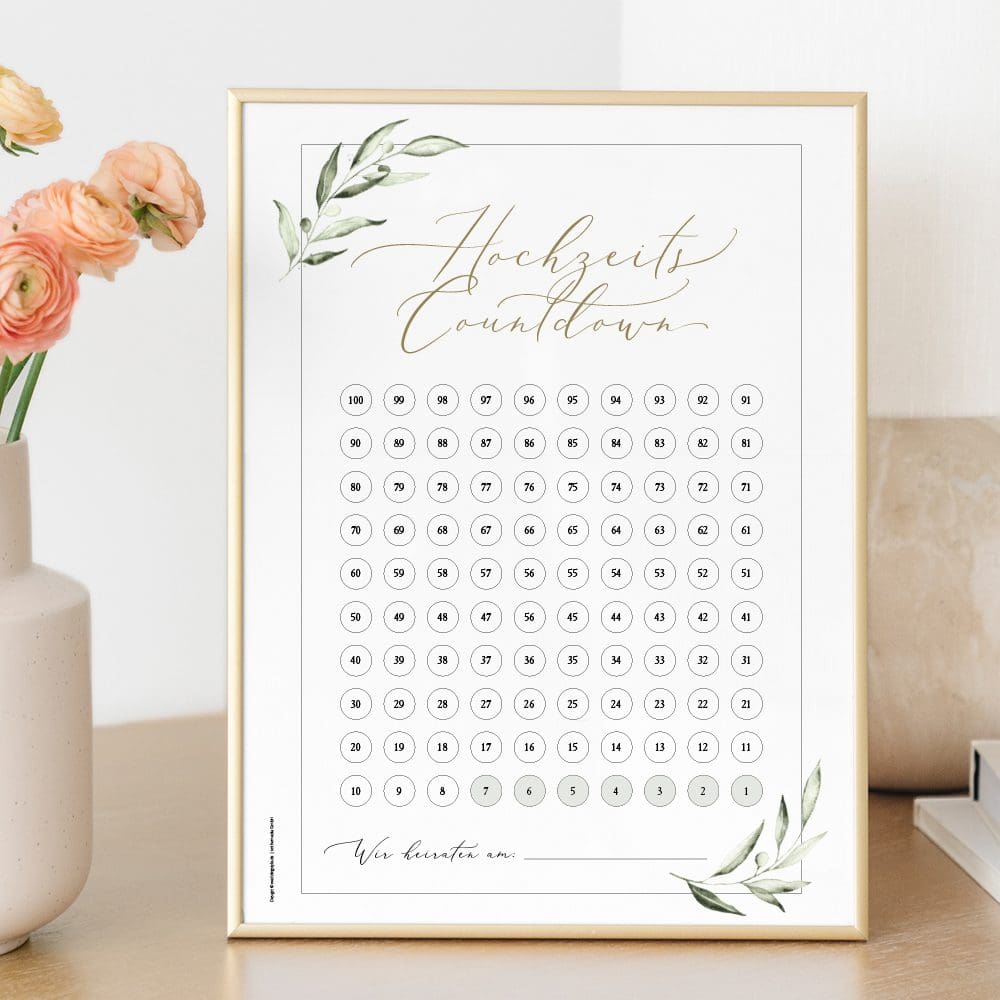 Schenkt dem Brautpaar zur Verlobung oder als kleines Geschenk kurz vor der Hochzeit ein süßes Poster, mit denen die letzten Tage voller Aufregung bis zur Hochzeit gezählt werden können.