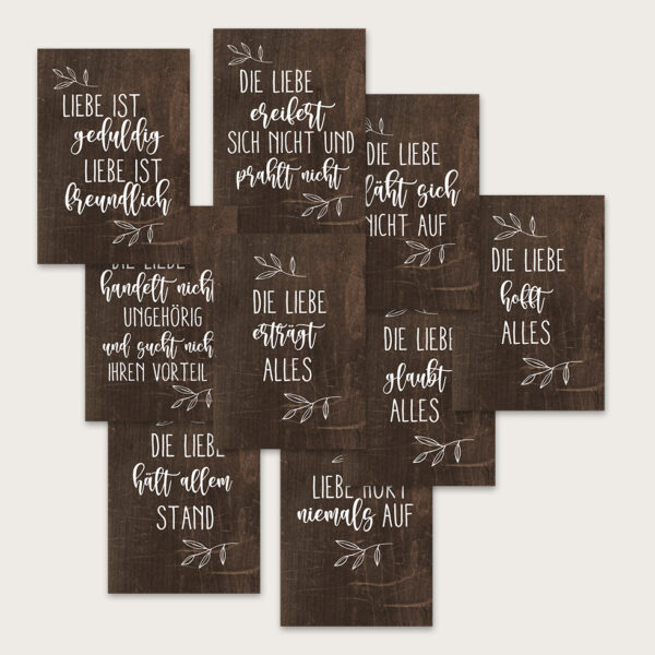 In unseren Designs haben wir euch bereits Sprüche aus dem das „Das Hohelied der Liebe“ (1. Korinter 13)  ergänzt. Ihr könnt aber auch eure Meilensteine, für euch wichtige Zitate über die Liebe oder ganz persönliche Worte verwenden.