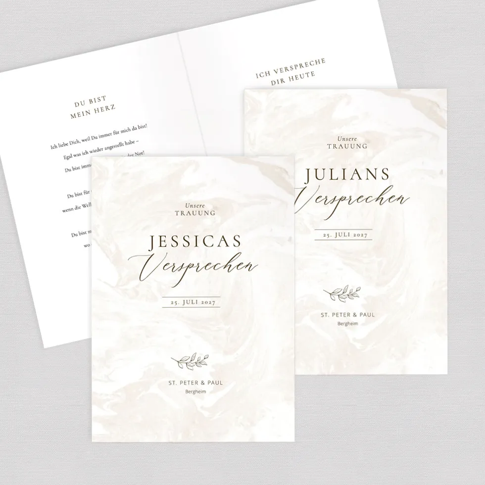 Haltet euer Versprechen füreinander für die Ewigkeit fest. Ihr könnt es entweder als Vorlage für den Außen-und Innenteil als PDF-Vorlage downloaden oder die Umschläge/Hefte von uns personalisiert und auf wunderschönes Papier gedruckt erhalten.