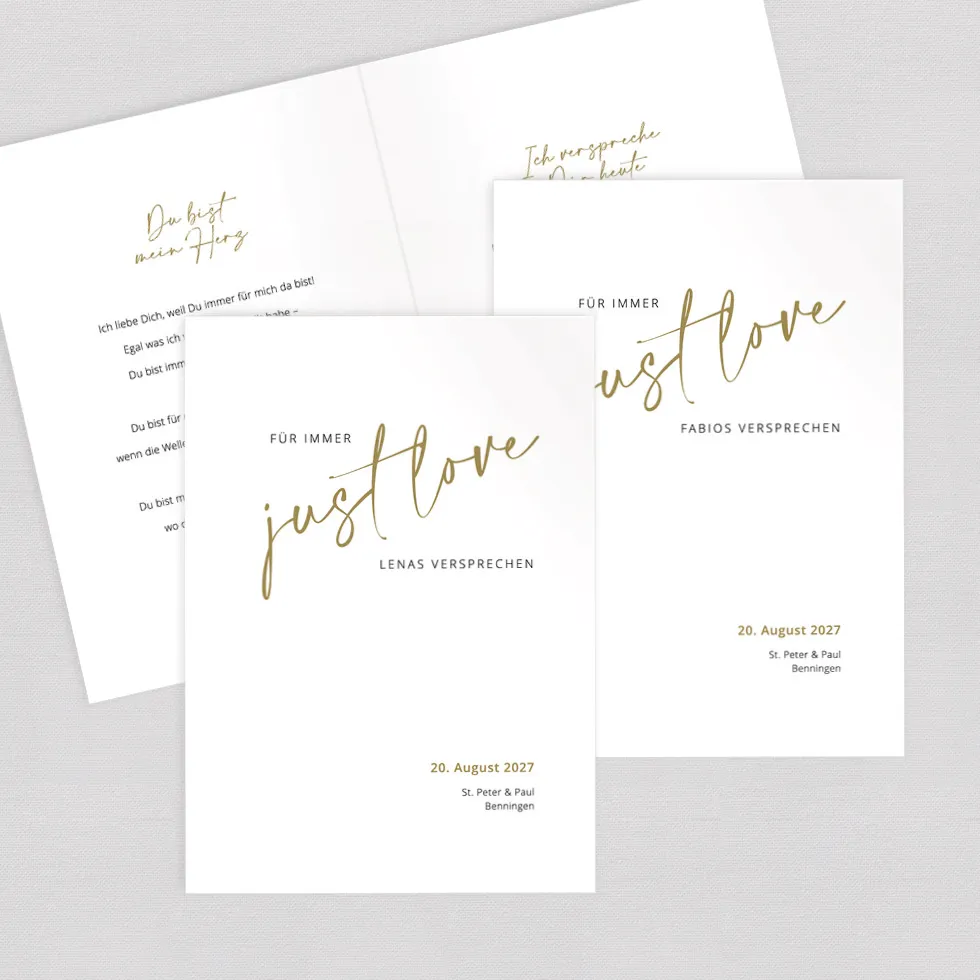 Haltet euer Versprechen füreinander für die Ewigkeit fest. Ihr könnt es entweder als Vorlage für den Außen-und Innenteil als PDF-Vorlage downloaden oder die Umschläge/Hefte von uns personalisiert und auf wunderschönes Papier gedruckt erhalten.