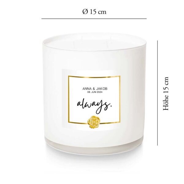 Diese elegante, große Hochzeitskerze im Glas wird mit euren Namen und dem Hochzeitsdatum liebevoll für euch personalisiert.