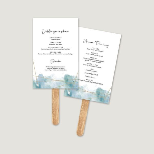 Eure Gäste werden absolut dankbar sein, wenn sie sich an heißen Tagen während der Trauung oder Feier eine frische Brise zufächern können. Umso genialer, wenn die Fächer personalisiert und mit verschiedensten Texten beschriften sind  – zum Beispiel dem Trauprogramm oder mit dem Tagesablauf eurer Hochzeit.