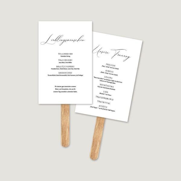Eure Gäste werden absolut dankbar sein, wenn sie sich an heißen Tagen während der Trauung oder Feier eine frische Brise zufächern können. Umso genialer, wenn die Fächer personalisiert und mit verschiedensten Texten beschriften sind  – zum Beispiel dem Trauprogramm oder mit dem Tagesablauf eurer Hochzeit.