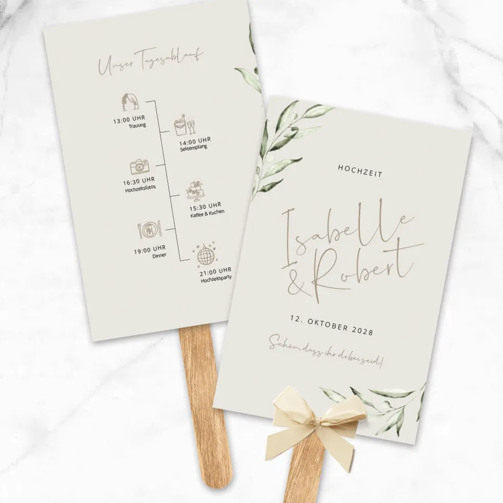 Gestaltet ganz individuelle Hochzeitsfächer, mit denen sich eure Gäste an heißen Tagen eine frische Brise zufächern können.
