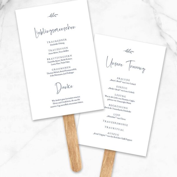 Eure Gäste werden absolut dankbar sein, wenn sie sich an heißen Tagen während der Trauung oder Feier eine frische Brise zufächern können. Umso genialer, wenn die Fächer personalisiert und mit verschiedensten Texten beschriften sind  – zum Beispiel dem Trauprogramm oder mit dem Tagesablauf eurer Hochzeit.