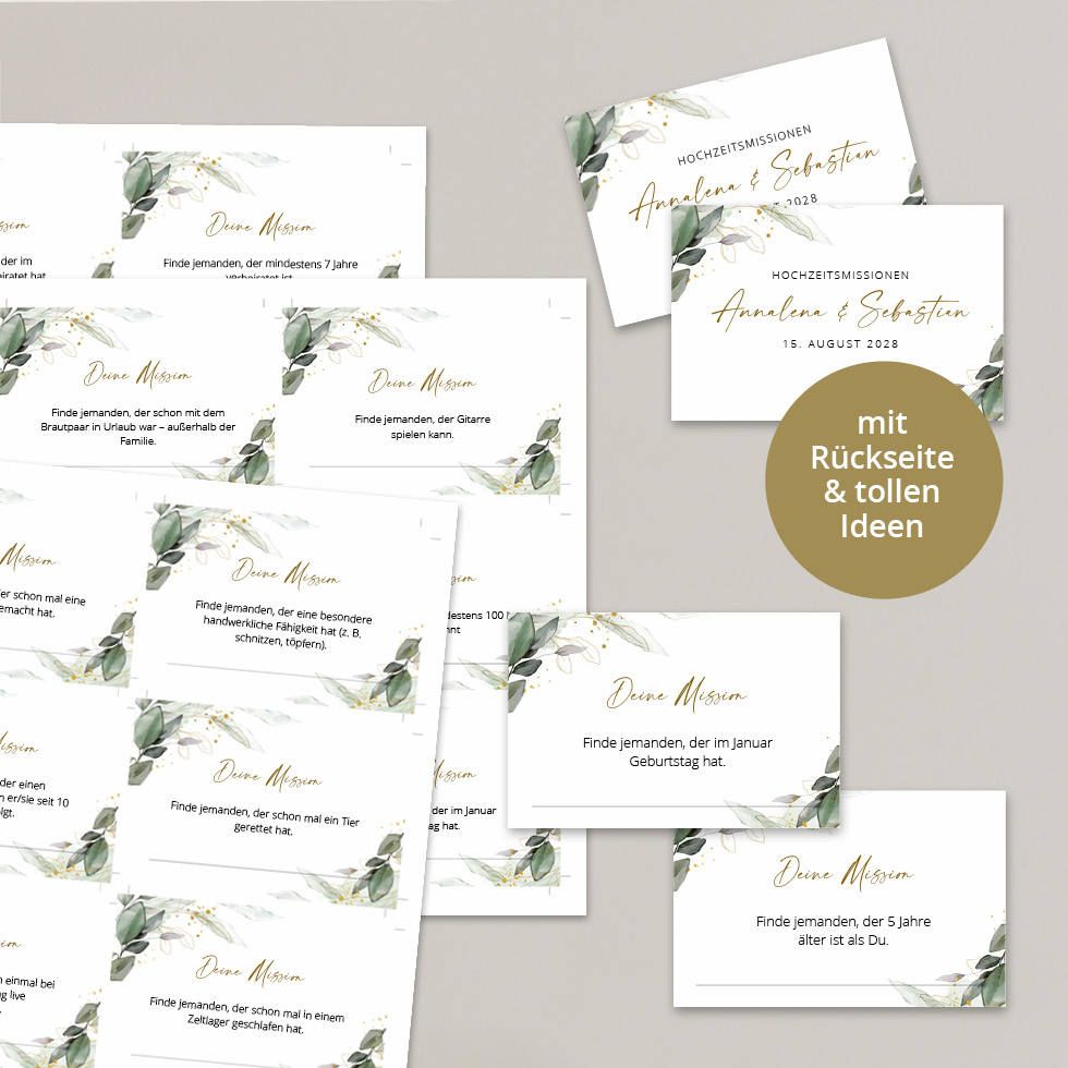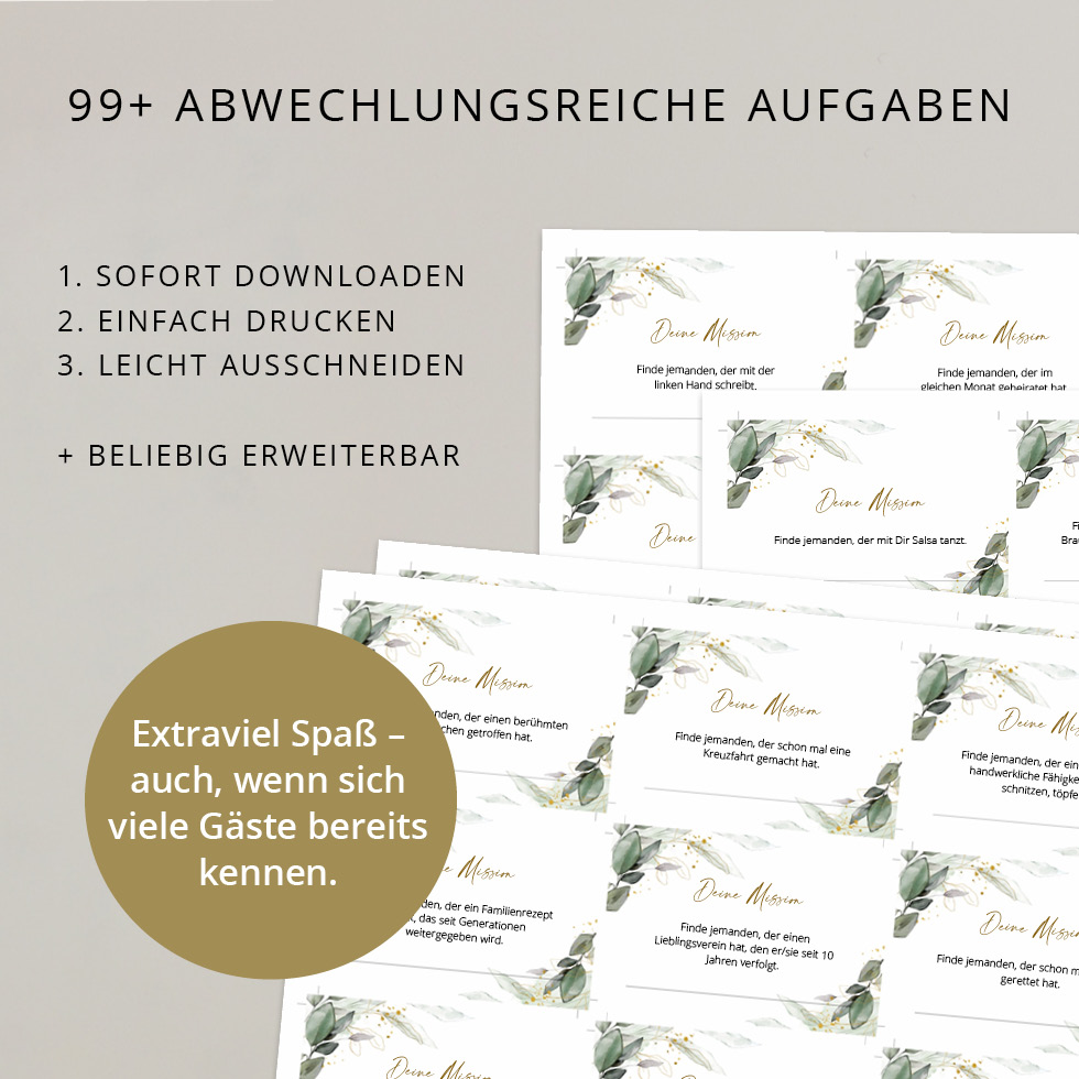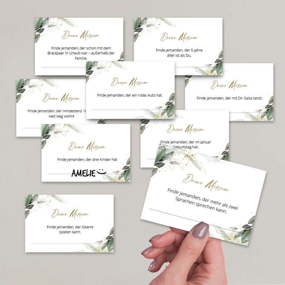 Das „Finde den Hochzeitsgast“-Spiel bringt die Gäste spielerisch miteinander ins Gespräch. Die Aufgaben bestehen aus besonderen Eigenschaften, Erlebnisse oder Gemeinsamkeiten, die es bei den Hochzeitsgästen zu entdecken gilt.