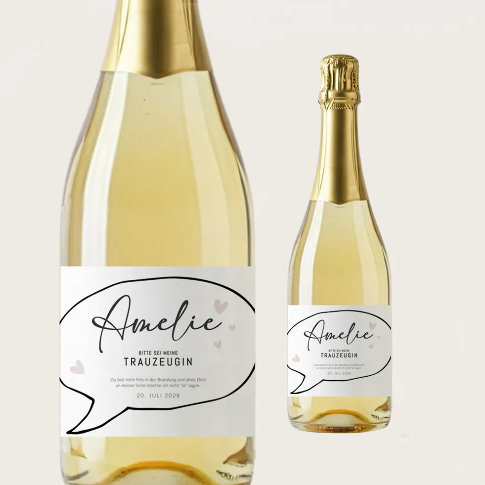 Gestaltet euer individuelles Flaschenetikett für Weinflaschen, Sektflaschen oder Spirituosen-Flaschen, um eure Trauzeugen zu fragen oder eine persönliche Botschaft an einen lieben Menschen zu übermitteln.