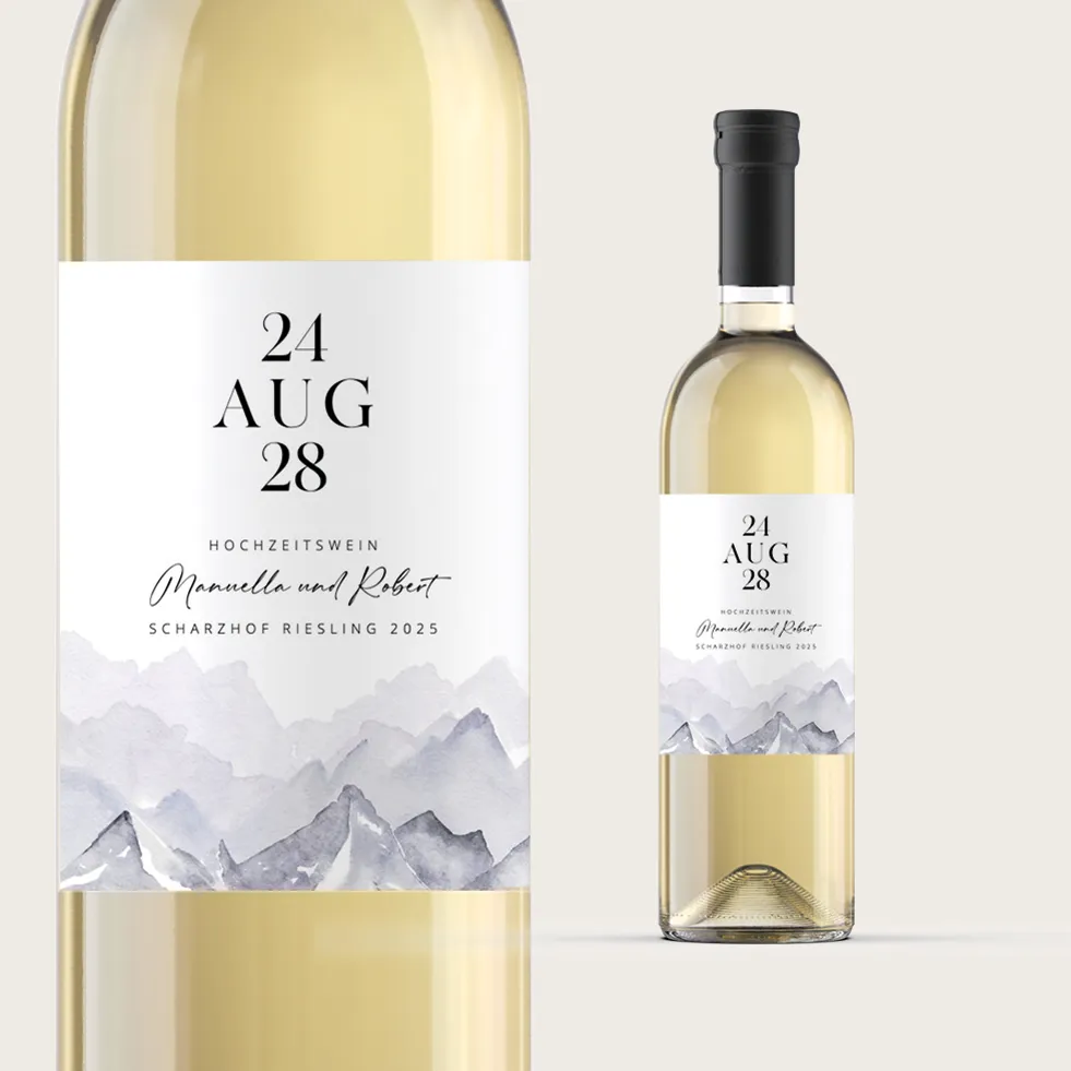 Gestaltet euer individuelles Flaschenetikett für Weinflaschen, Sektflaschen oder Wasserflaschen – zur Hochzeit, als liebevolles, persönliches Geschenk oder für Jubiläen.