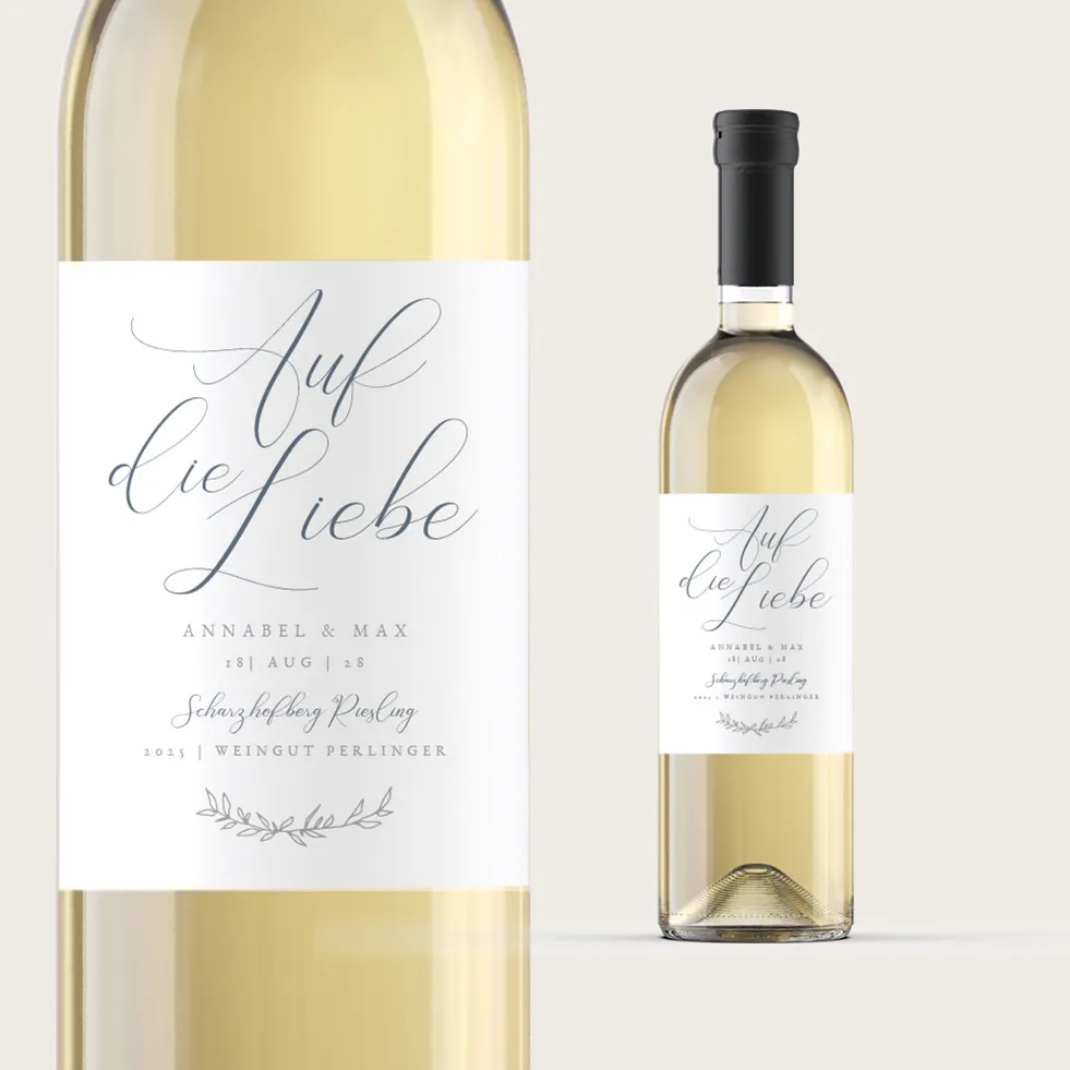 Gestaltet euer individuelles Flaschenetikett für Weinflaschen, Sektflaschen oder Wasserflaschen – zur Hochzeit, als liebevolles, persönliches Geschenk oder für Jubiläen.