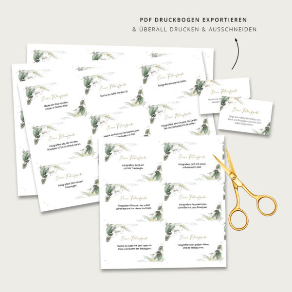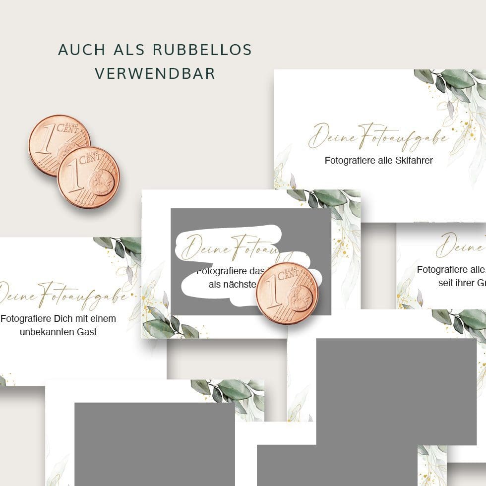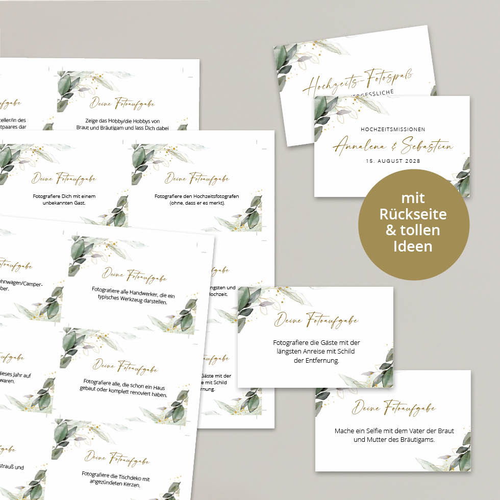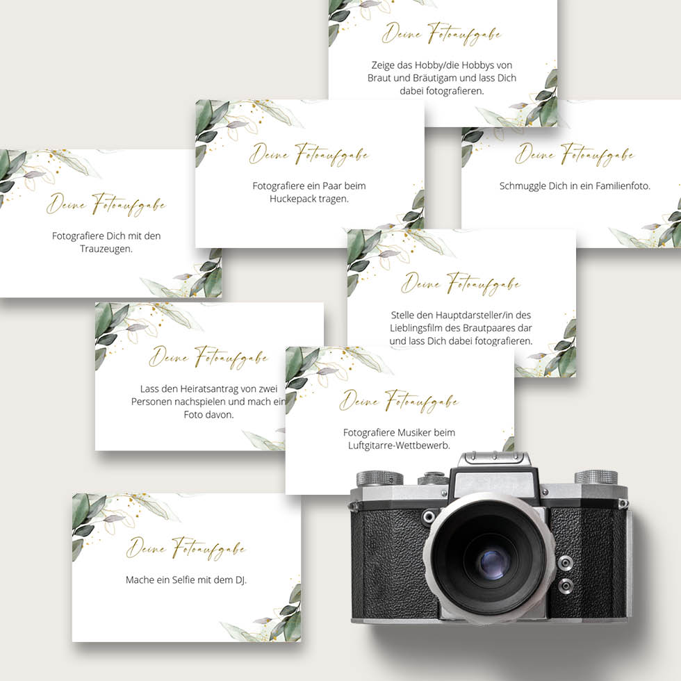 Mit unserem Fotospiel haben eure Gäste bei der Hochzeit garantiert doppelt Spaß und ihr erhaltet die schönsten Fotos. Holt euch unsere Fotoaufgaben Vorlage mit Eukalyptus-Design zum einfachen Selberdrucken:
