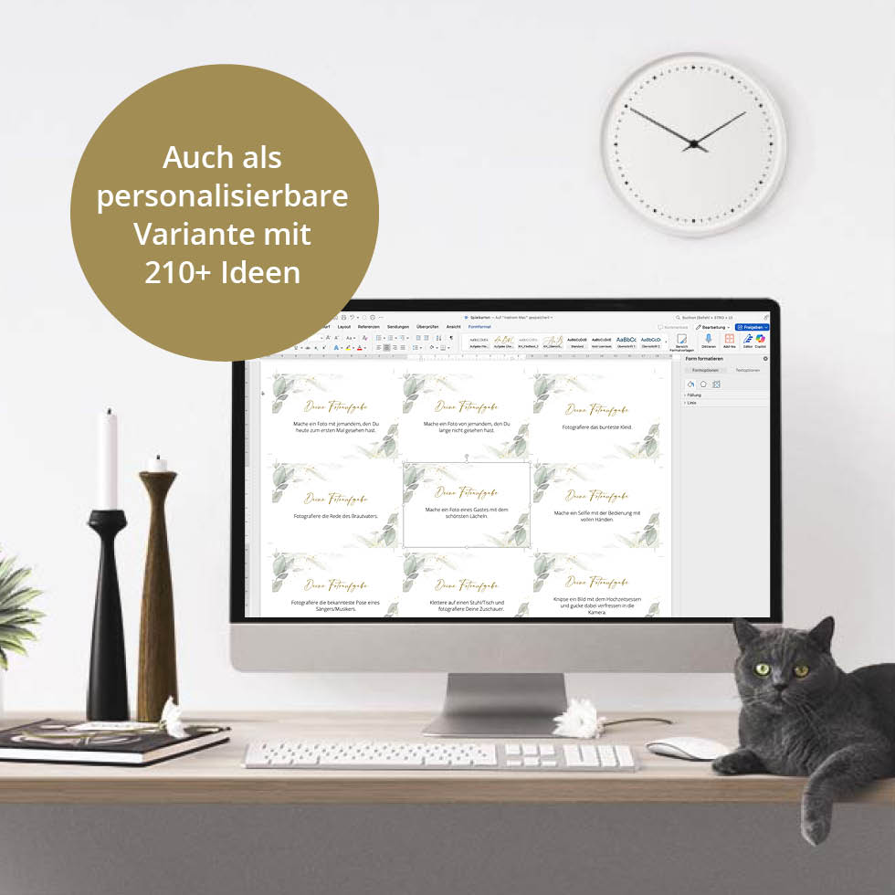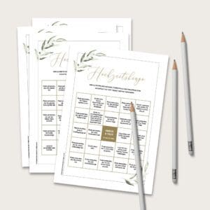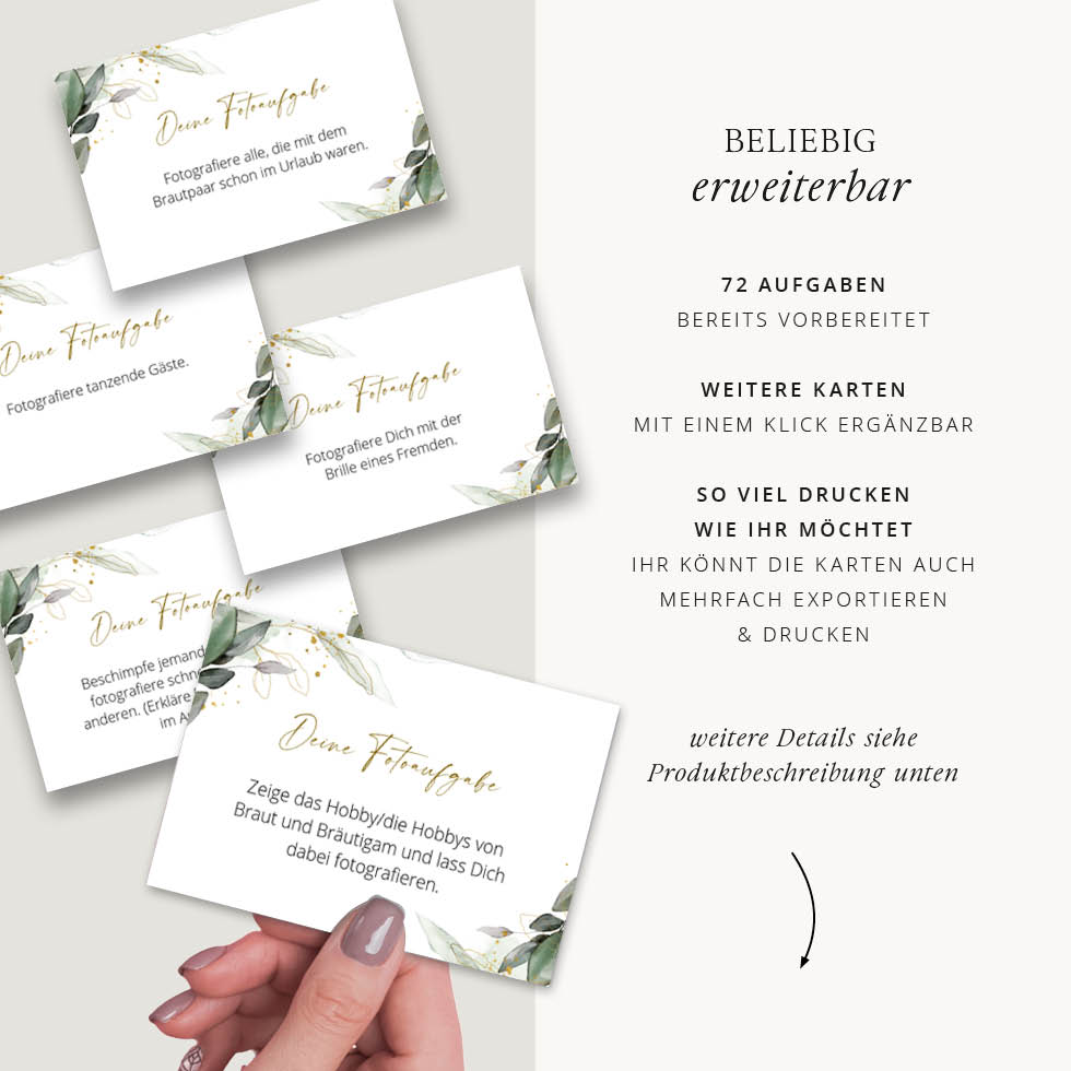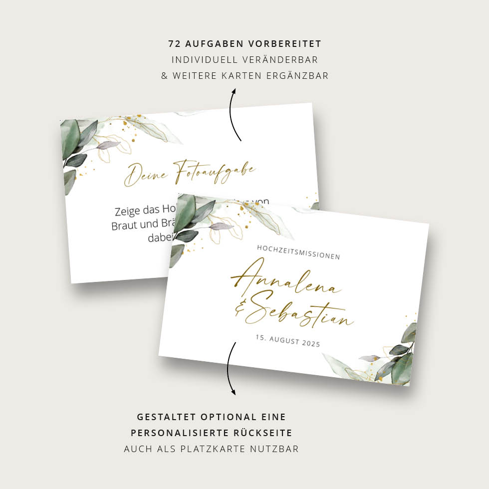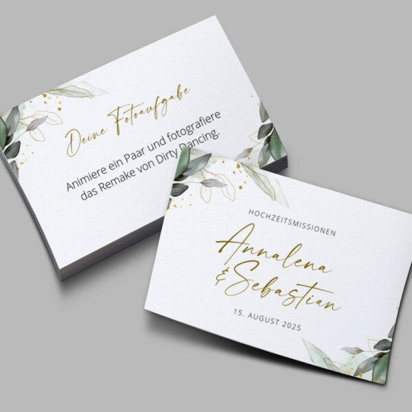 Mit unserem Fotospiel haben eure Gäste bei der Hochzeit garantiert doppelt Spaß und ihr erhaltet die schönsten Fotos. Holt euch unsere Fotoaufgaben Vorlage mit Eukalyptus-Design zum einfachen Selberdrucken: