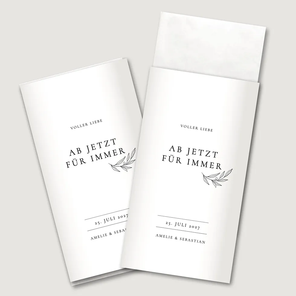 Wir drucken eure Freudentränen Banderolen auf seidenglattem 160 g Papier – perfekt um sie ganz einfach um ein Taschentuch zu legen. Der passende transparente Aufkleber zum Zusammenkleben ist beinhaltet.