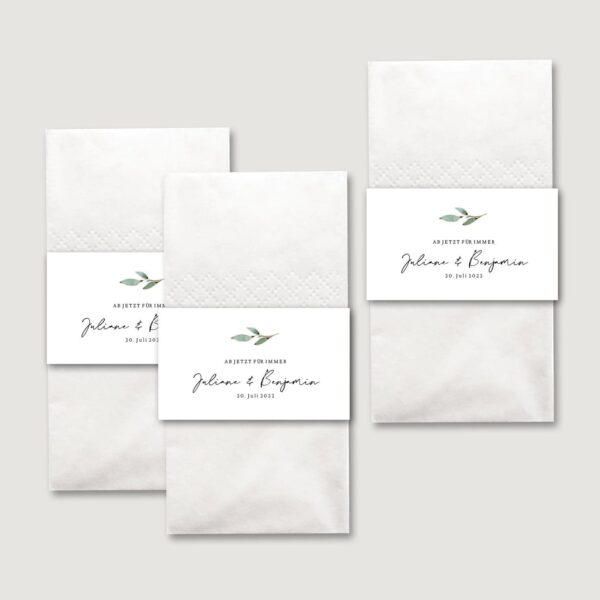 Stellt eure Freudentränen Taschentücher zur Selbstbedienung in einem kleinen Kästchen am Eingang zur Trauung auf. Durch den oberen Rad kann sich jeder Gast bedienen ohne die anderen Taschentücher zu berühren. Alternativ könnt ihr die Banderolen benutzen, um die Freudentränen Taschentücher in den Umschlag eures Trauhefts oder auf der Rückseite einer Tagesablauf-Karte zu kleben.