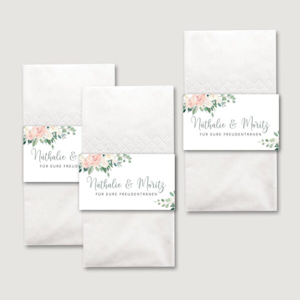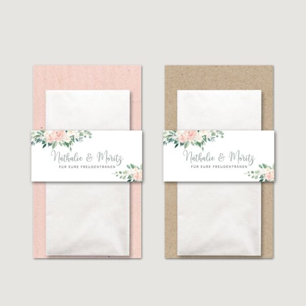 Stellt eure Freudentränen Taschentücher zur Selbstbedienung in einem kleinen Kästchen am Eingang zur Trauung auf. Durch den oberen Rad kann sich jeder Gast bedienen ohne die anderen Taschentücher zu berühren. Alternativ könnt ihr die Banderolen benutzen, um die Freudentränen Taschentücher in den Umschlag eures Trauhefts oder auf der Rückseite einer Tagesablauf-Karte zu kleben.