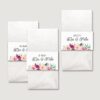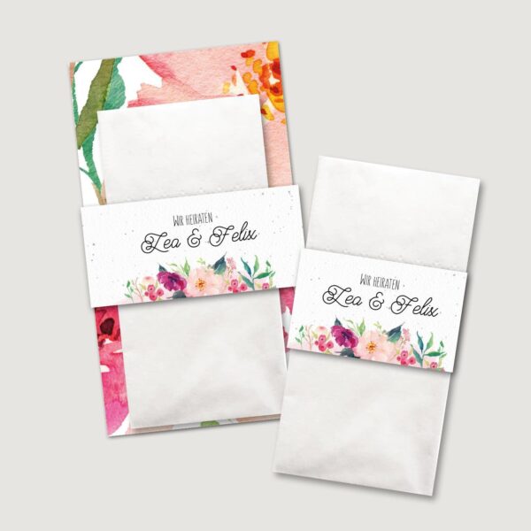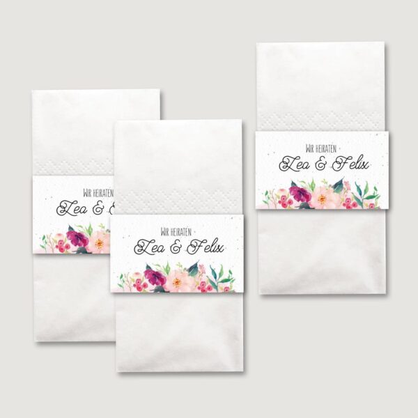 Stellt eure Freudentränen Taschentücher zur Selbstbedienung in einem kleinen Kästchen am Eingang zur Trauung auf. Durch den oberen Rad kann sich jeder Gast bedienen ohne die anderen Taschentücher zu berühren. Alternativ könnt ihr die Banderolen benutzen, um die Freudentränen Taschentücher in den Umschlag eures Trauhefts oder auf der Rückseite einer Tagesablauf-Karte zu kleben.