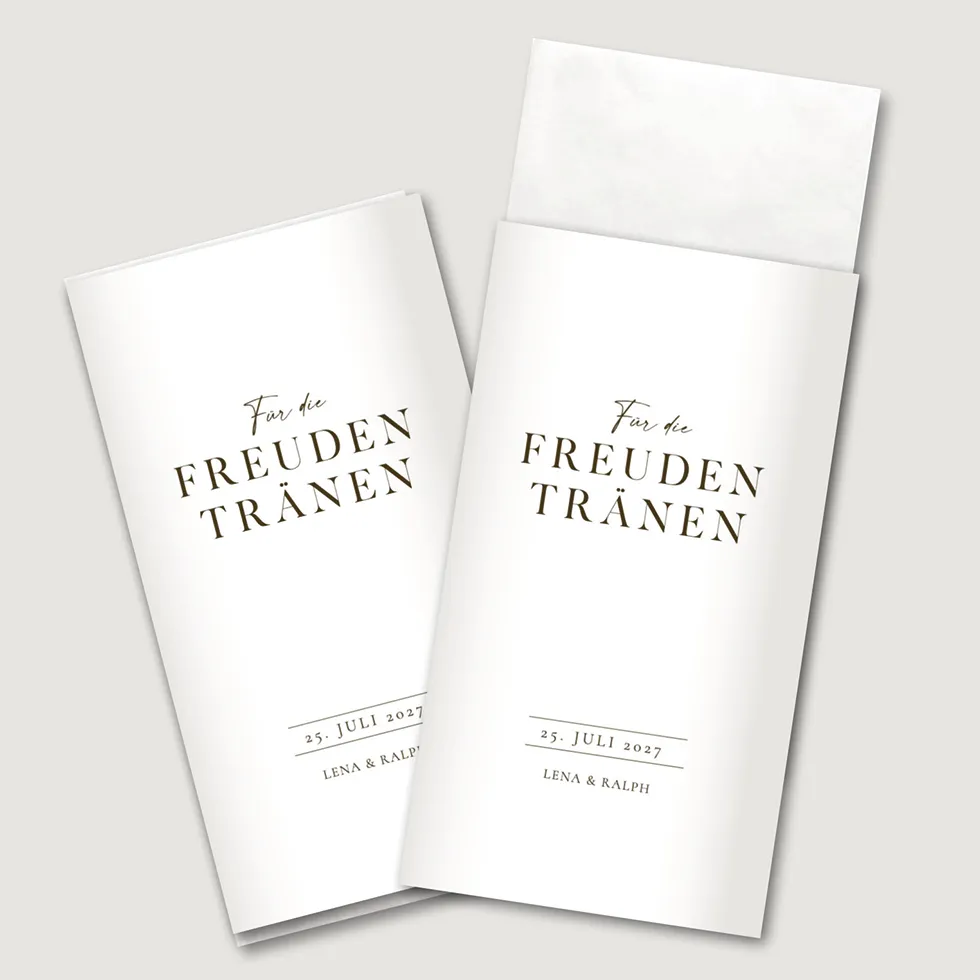 Wir drucken eure Freudentränen Banderolen auf seidenglattem 160 g Papier – perfekt um sie ganz einfach um ein Taschentuch zu legen. Der passende transparente Aufkleber zum Zusammenkleben ist beinhaltet.