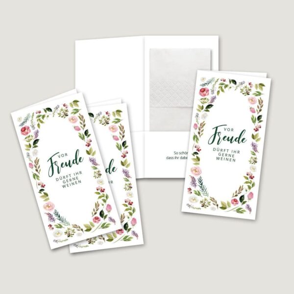 Der Clou dieser Freudentränen Hüllen ist, dass ihr durch die clevere Faltung. Denn ihr verpackt damit euer Taschentuch absolut hygienisch und obwohl ihr lediglich einseitig ausdruckt, habt auch innen einen individuellen Text ergänzt.