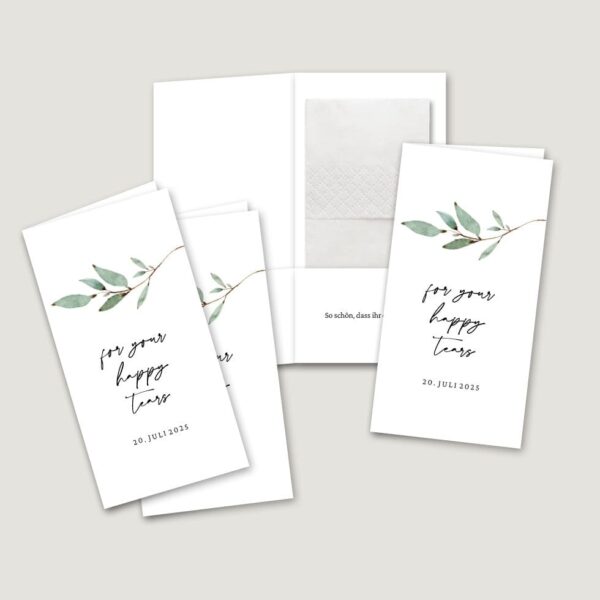 Der Clou dieser Freudentränen Hüllen ist, dass ihr durch die clevere Faltung. Denn ihr verpackt damit euer Taschentuch absolut hygienisch und obwohl ihr lediglich einseitig ausdruckt, habt auch innen einen individuellen Text ergänzt.