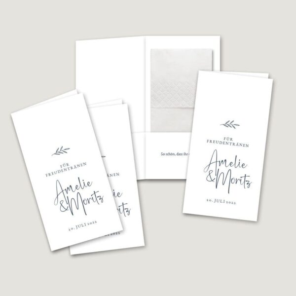 Der Clou dieser Freudentränen Hüllen ist, dass ihr durch die clevere Faltung. Denn ihr verpackt damit euer Taschentuch absolut hygienisch und obwohl ihr lediglich einseitig ausdruckt, habt auch innen einen individuellen Text ergänzt.