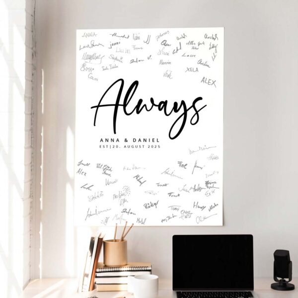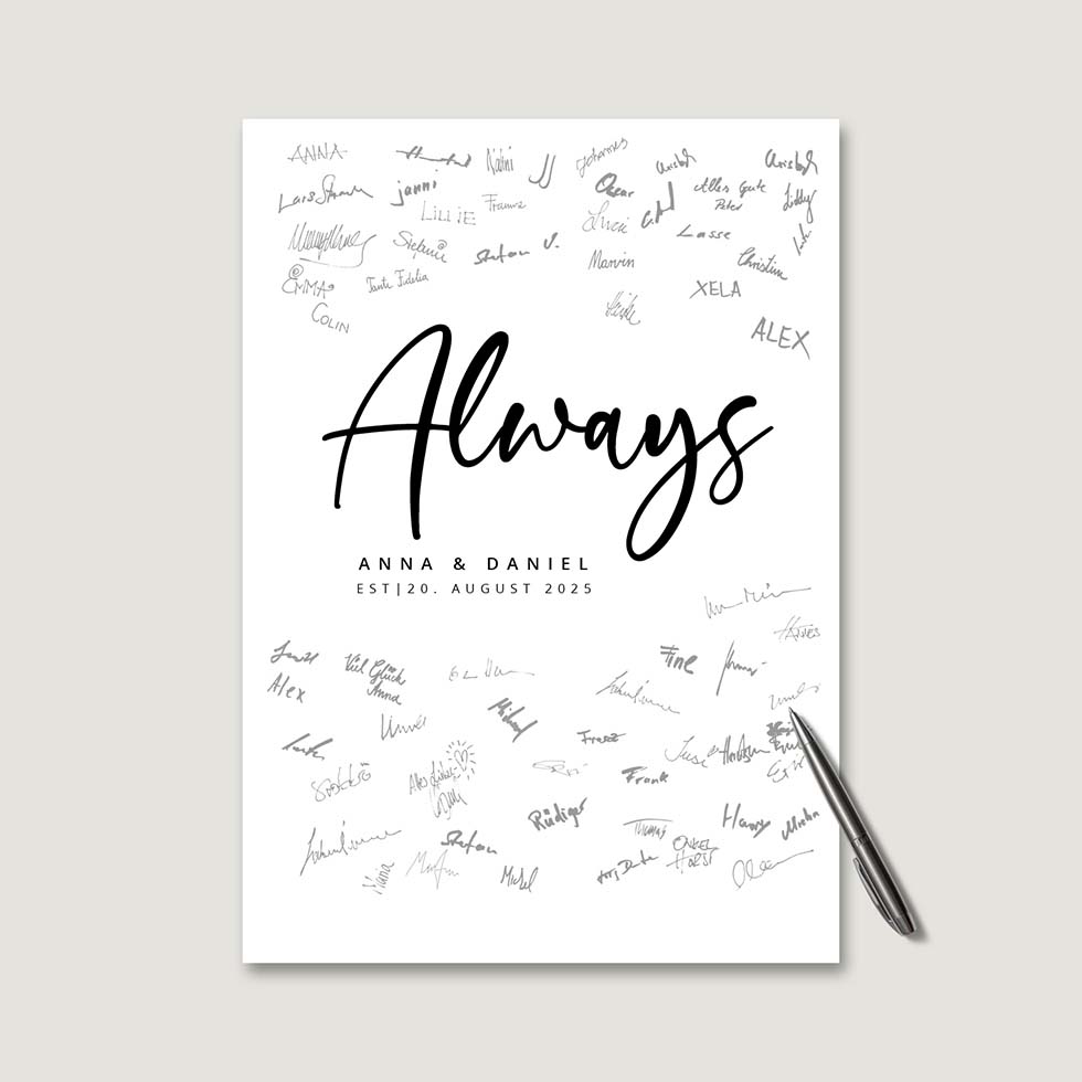 Gestaltet mit eurem individuellen Text ein personalisiertes Gästebuch als Bild, das ihr nach der Hochzeit gerne an die Wand hängen werdet.