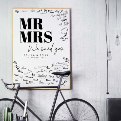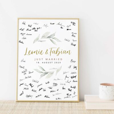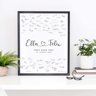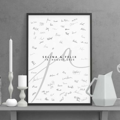 Lasst eure Gäste für euch mit ihren Unterschriften ein echtes Kunstwerk erstellen. Legt einen Permanent-Marker in Schwarz, einen grauen Lackstift oder oder einen Gold- oder Silber-Metallic-Stift bereit und schon wird euer Gästebuch von euren Gästen in ein absolutes Unikat verwandelt.