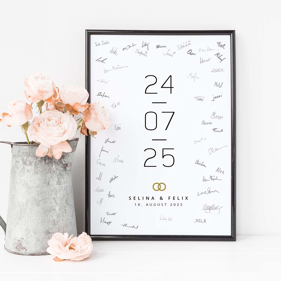 Gestaltet mit eurem individuellen Text ein personalisiertes Gästebuch als Bild, das ihr nach der Hochzeit gerne an die Wand hängen werdet.
