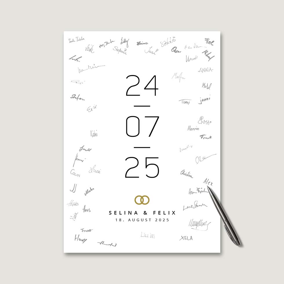 Lasst eure Gäste für euch mit ihren Unterschriften ein echtes Kunstwerk erstellen. Legt einen Permanent-Marker in Schwarz, einen grauen Lackstift oder oder einen Gold- oder Silber-Metallic-Stift bereit und schon wird euer Gästebuch von euren Gästen in ein absolutes Unikat verwandelt.