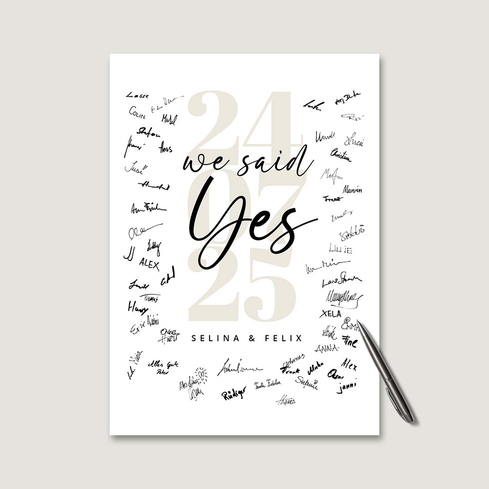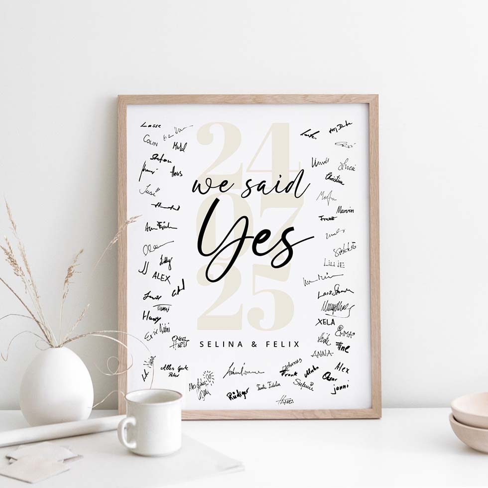 Gestaltet mit eurem individuellen Text ein personalisiertes Gästebuch als Bild, das ihr nach der Hochzeit gerne an die Wand hängen werdet.