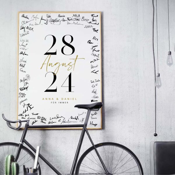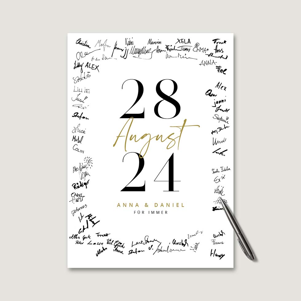 Lasst eure Gäste für euch mit ihren Unterschriften ein echtes Kunstwerk erstellen. Legt einen Permanent-Marker in Schwarz, einen grauen Lackstift oder oder einen Gold- oder Silber-Metallic-Stift bereit und schon wird euer Gästebuch von euren Gästen in ein absolutes Unikat verwandelt.