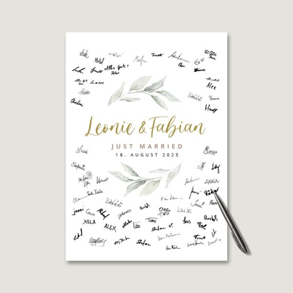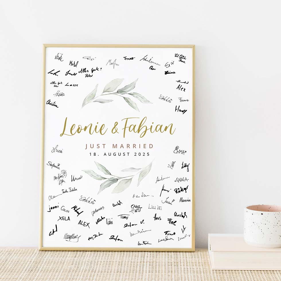 Gestaltet mit eurem individuellen Text ein personalisiertes Gästebuch als Bild, das ihr nach der Hochzeit gerne an die Wand hängen werdet.