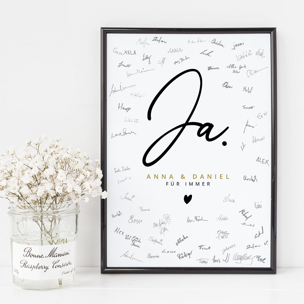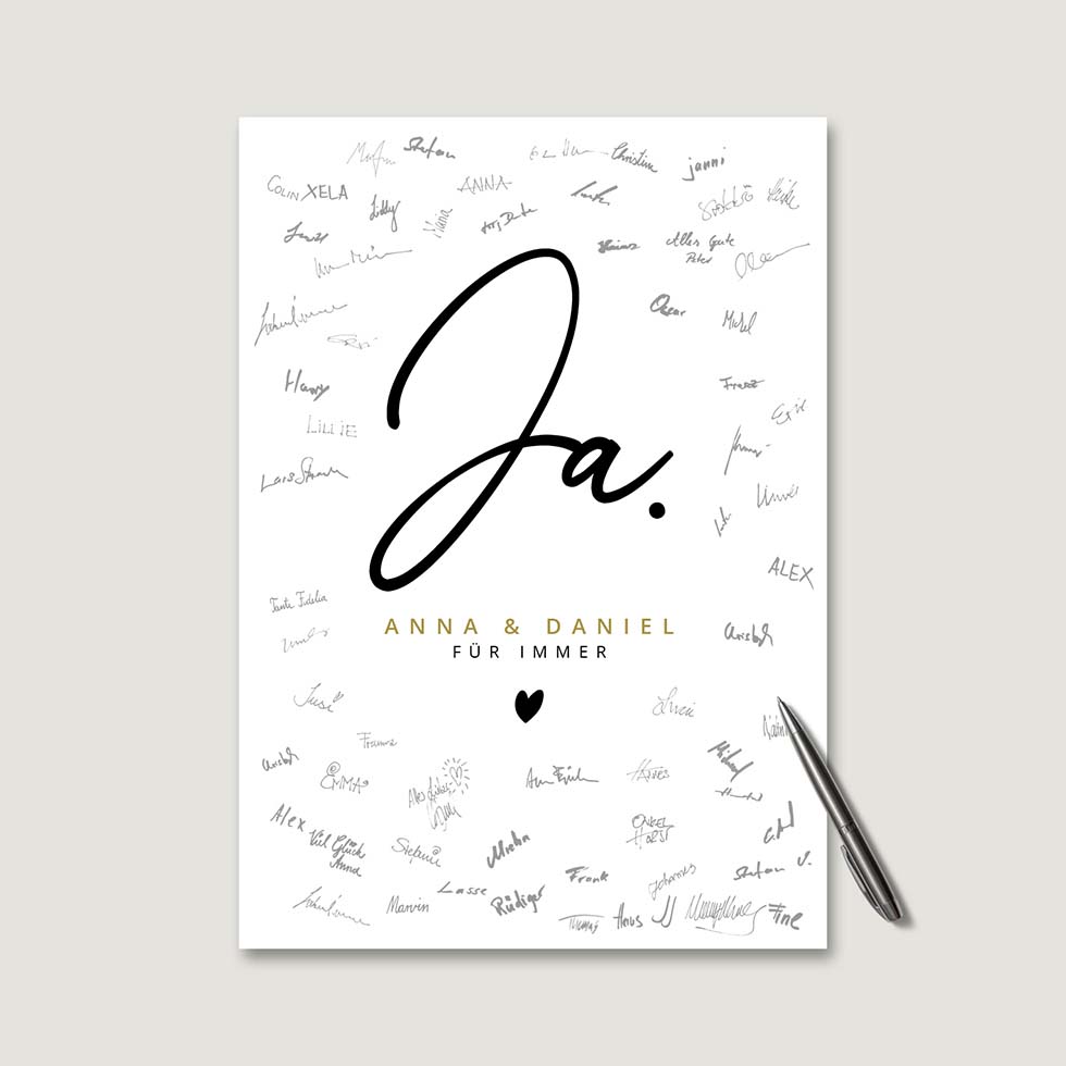 Lasst eure Gäste für euch mit ihren Unterschriften ein echtes Kunstwerk erstellen. Legt einen Permanent-Marker in Schwarz, einen grauen Lackstift oder oder einen Gold- oder Silber-Metallic-Stift bereit und schon wird euer Gästebuch von euren Gästen in ein absolutes Unikat verwandelt.