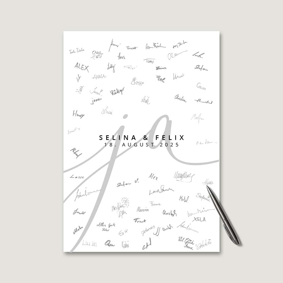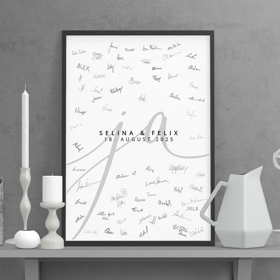 Gestaltet mit eurem individuellen Text ein personalisiertes Gästebuch als Bild, das ihr nach der Hochzeit gerne an die Wand hängen werdet.
