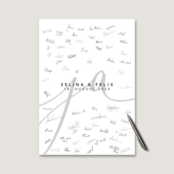 Lasst eure Gäste für euch mit ihren Unterschriften ein echtes Kunstwerk erstellen. Legt einen Permanent-Marker in Schwarz, einen grauen Lackstift oder oder einen Gold- oder Silber-Metallic-Stift bereit und schon wird euer Gästebuch von euren Gästen in ein absolutes Unikat verwandelt.
