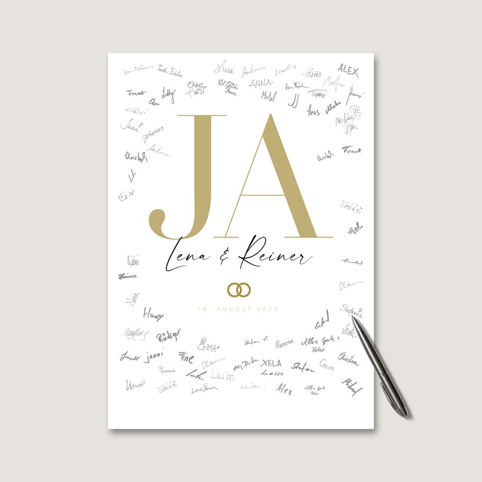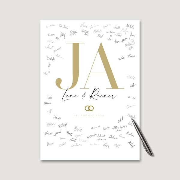 Gestaltet mit eurem individuellen Text ein personalisiertes Gästebuch als Bild, das ihr nach der Hochzeit gerne an die Wand hängen werdet.