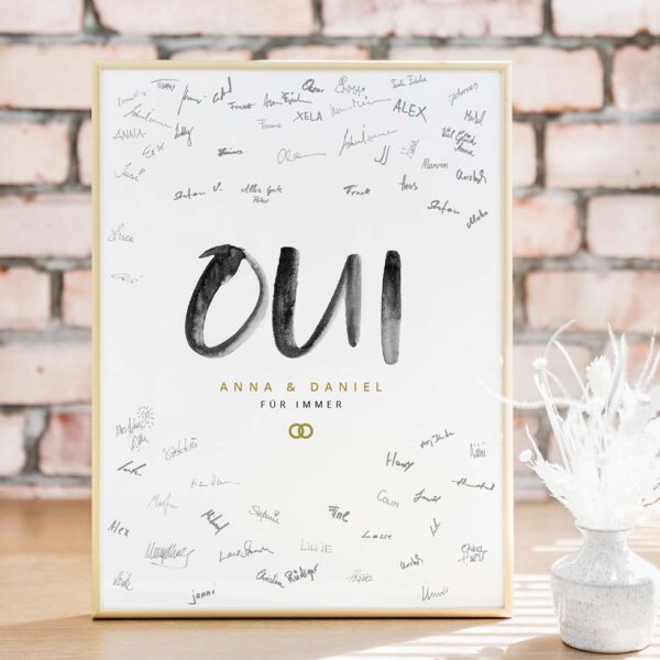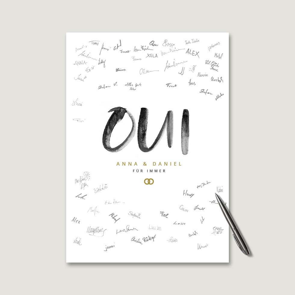 Lasst eure Gäste für euch mit ihren Unterschriften ein echtes Kunstwerk erstellen. Legt einen Permanent-Marker in Schwarz, einen grauen Lackstift oder oder einen Gold- oder Silber-Metallic-Stift bereit und schon wird euer Gästebuch von euren Gästen in ein absolutes Unikat verwandelt.