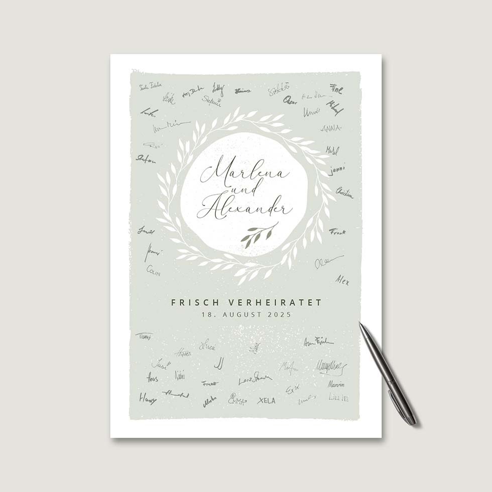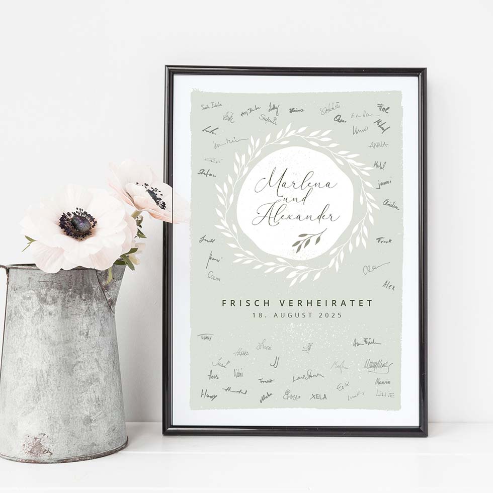 Gestaltet mit eurem individuellen Text ein personalisiertes Gästebuch als Bild, das ihr nach der Hochzeit gerne an die Wand hängen werdet.