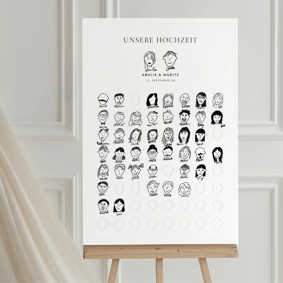 Euer Gästebuch als Bild, das alle mitreißt: Gäste zeichnen kleine Gesichter – und mit jeder Zeichnung wächst euer Unikat. Dank unserer Vorlagen klappt’s auch für Zeichenmuffel mit dezent vorgezeichnete Umrisse in Grau als Orientierung – und genug Freiheit für die eigene Zeichnung.