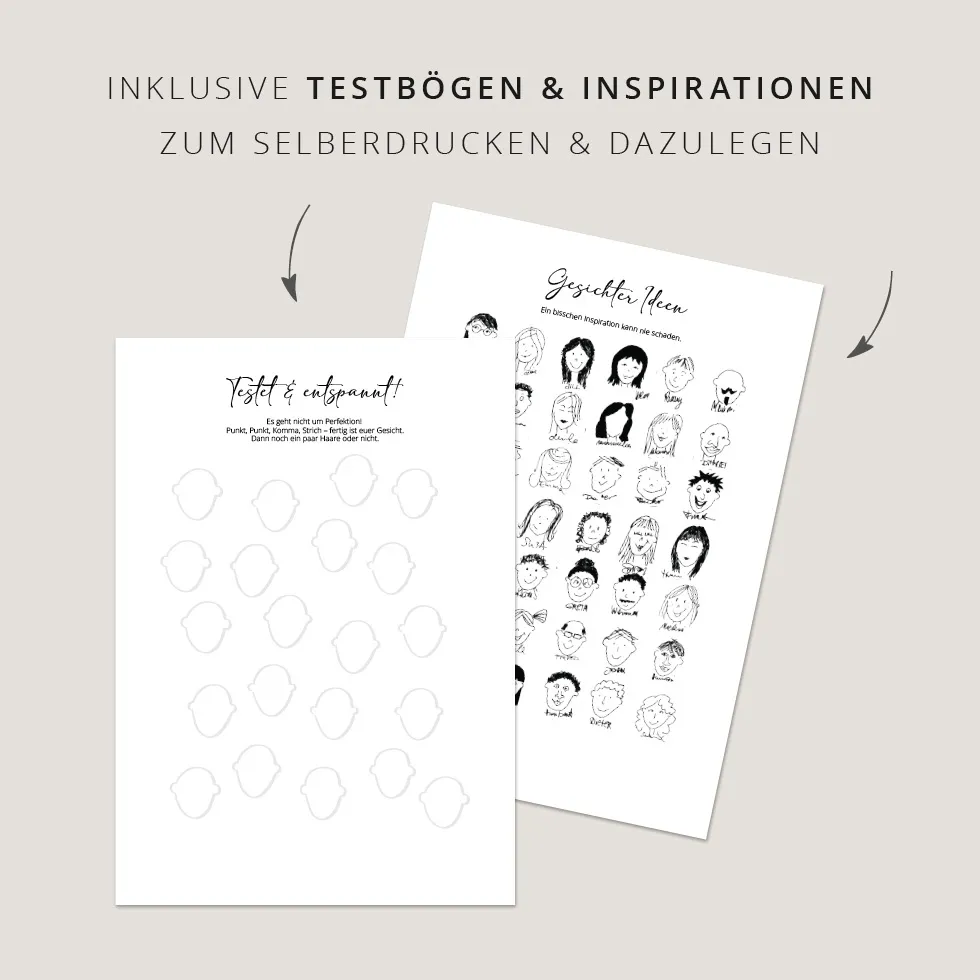 Bonus: Testbögen zum Download und Selbstausdrucken. So verlieren auch „Ich kann nicht zeichnen“-Gäste die Hemmung. Denn Perfektion ist unnötig. Punkt, Punkt, Komma, Strich – das kann jeder und macht jedem Spaß.